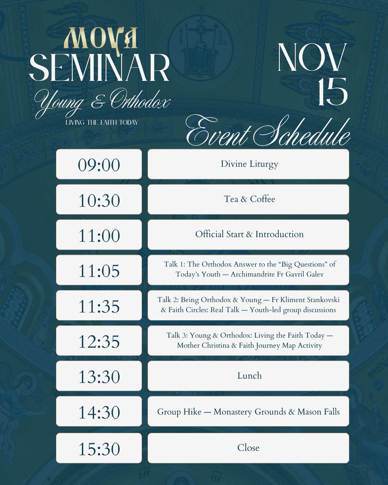 Македонската Православна Младина на Австралија (МОУА) со голема радост и благодарност известува дека на 15 ноември 2025 година (сабота), во манастирот „Свети Климент Охридски“ во Кинг Лејк, успешно се одржа 17-тиот по ред Годишен младински семинар – најзначајниот настан за православната младина во Австралија.