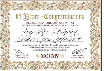 On the occasion of the congratulations conveyed, the letter of appreciation, and the gift presented as a sign of church recognition by the Australian–Sydney Eparchy, the awarded and highly esteemed Protopresbyter-Stavrophore Fr. Spase Stefanovski—who in 2025 marked a full 65 years since his ordination to the priesthood—expressed his gratitude for the attention shown by sending letters of thanks to the Eparchial Administrative Board of the Australian–Sydney Eparchy, as well as to the Administration of the Macedonian Orthodox Community for Melbourne and Victoria.