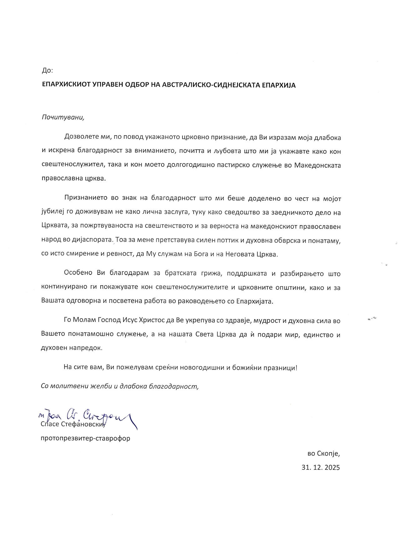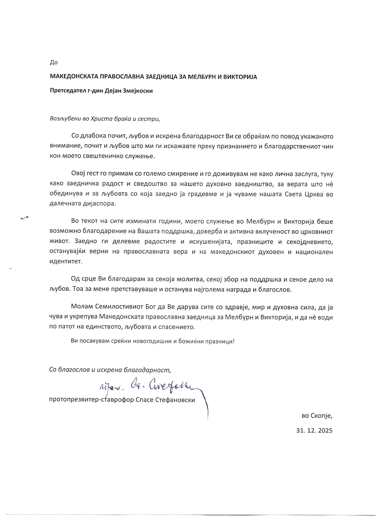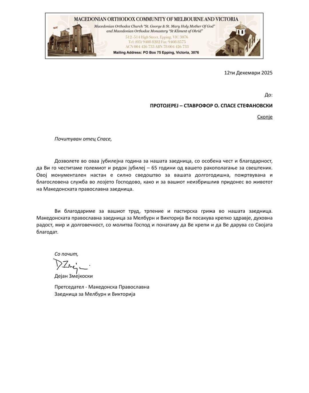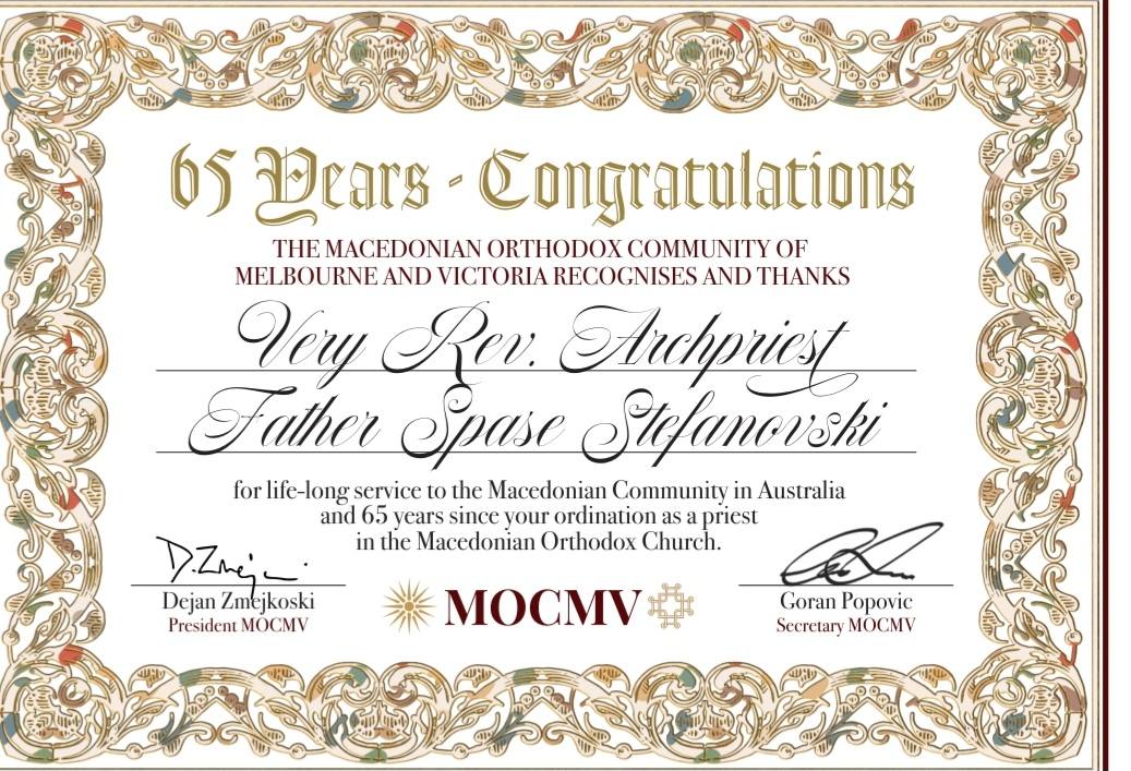 The plaque and congratulatory letters were presented on behalf of the Australian–Sydney Diocese of the Macedonian Orthodox Church – Ohrid Archbishopric, as well as on behalf of the Macedonian Orthodox Community of Melbourne and Victoria, as an expression of respect for his role as parish priest, spiritual leader, and episcopal vicar.
