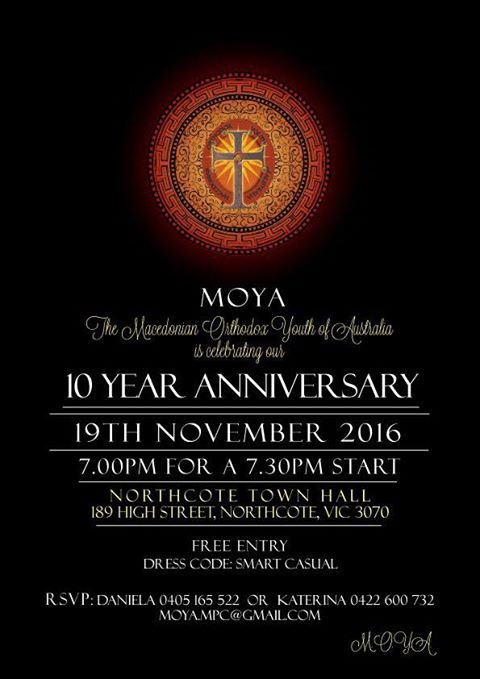 На 19. 11. 2016 година Македонската Православна Младина на Австралија (MOYA) одбележа 10 години од нејзиното основање.