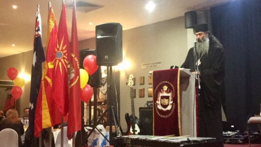 Со пеење на молитвата „Оче наш“ и благослов од свештенството започна свечената академија, на која најпрво беше прочитано посланието на нашиот почитуван и многуценет архиереј, Митрополитот Дебарско-кичевски и Администратор Австралиско-сиднејски г. Тимотеј, кој иако оправдано не можеше телесно да присуствува, сепак тој наш пастир и таа вечер беше присутен меѓу нам, со своето послание, кое го испрати до нас, како некогаш апостолот Павле кој им пишувал на Македонците. (целосното обраќање на Митрополитот г. Тимотеј можете да го прочитате на следниот линк: http://mpcaus.org/obrakanje-na-dedo-timotej-do-ase/ ).