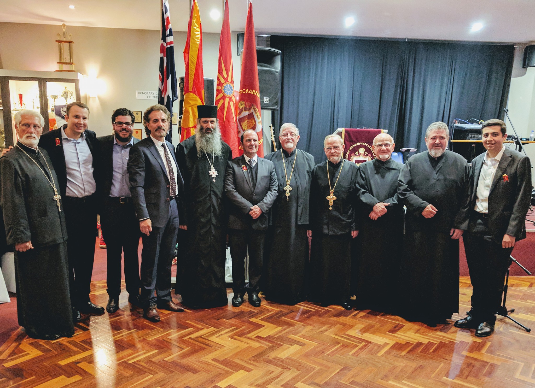 Со пеење на молитвата „Оче наш“ и благослов од свештенството започна свечената академија, на која најпрво беше прочитано посланието на нашиот почитуван и многуценет архиереј, Митрополитот Дебарско-кичевски и Администратор Австралиско-сиднејски г. Тимотеј, кој иако оправдано не можеше телесно да присуствува, сепак тој наш пастир и таа вечер беше присутен меѓу нам, со своето послание, кое го испрати до нас, како некогаш апостолот Павле кој им пишувал на Македонците. (целосното обраќање на Митрополитот г. Тимотеј можете да го прочитате на следниот линк: http://mpcaus.org/obrakanje-na-dedo-timotej-do-ase/ ).