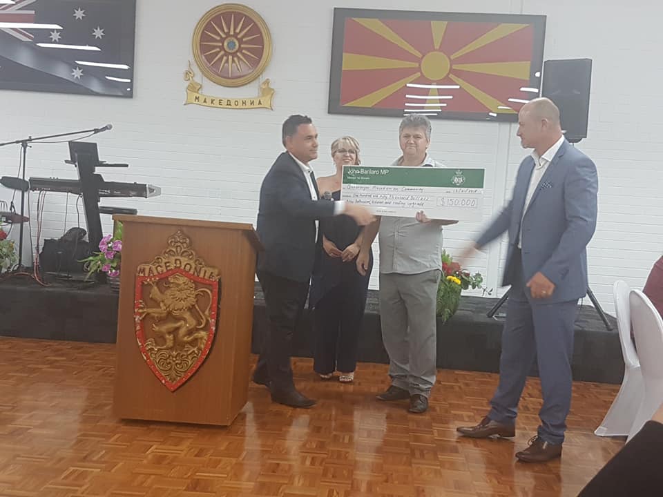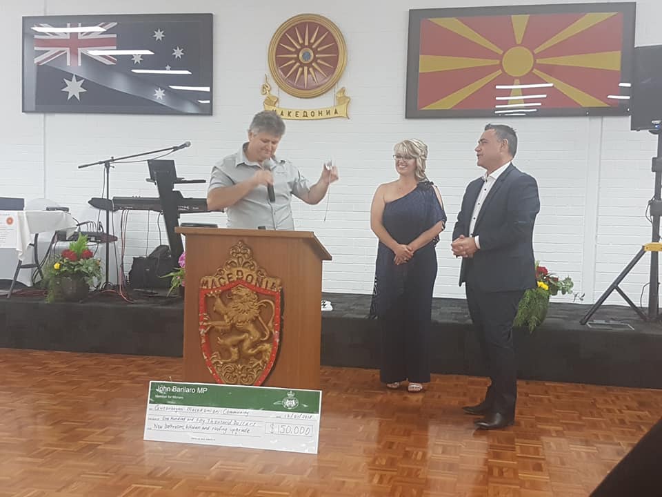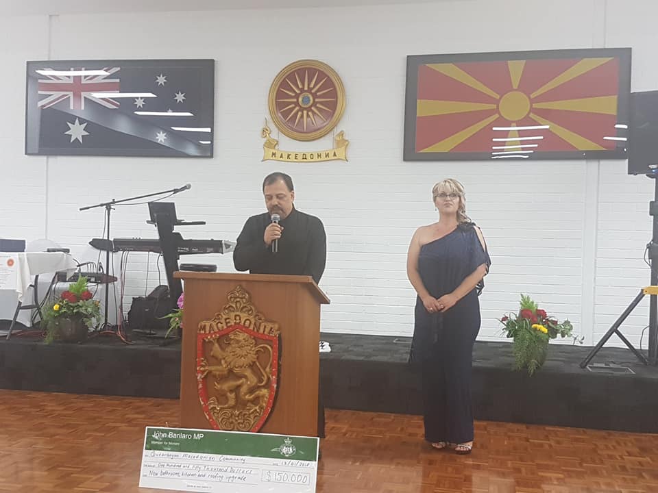 Со своето присуство вечерта ја збогати и в.д. Премиерот на НЈВ Џон Бариларо, кој е голем поддржувач на Македонците во Австралија Со негова заложба како и на македонските активисти од Квинвијан, од државата НЈВ беше дониран чек од 150.000 долари за разој и надградба на културниот центар и сите други објекти кои ги користат Македонците од овој дел на Австралија.