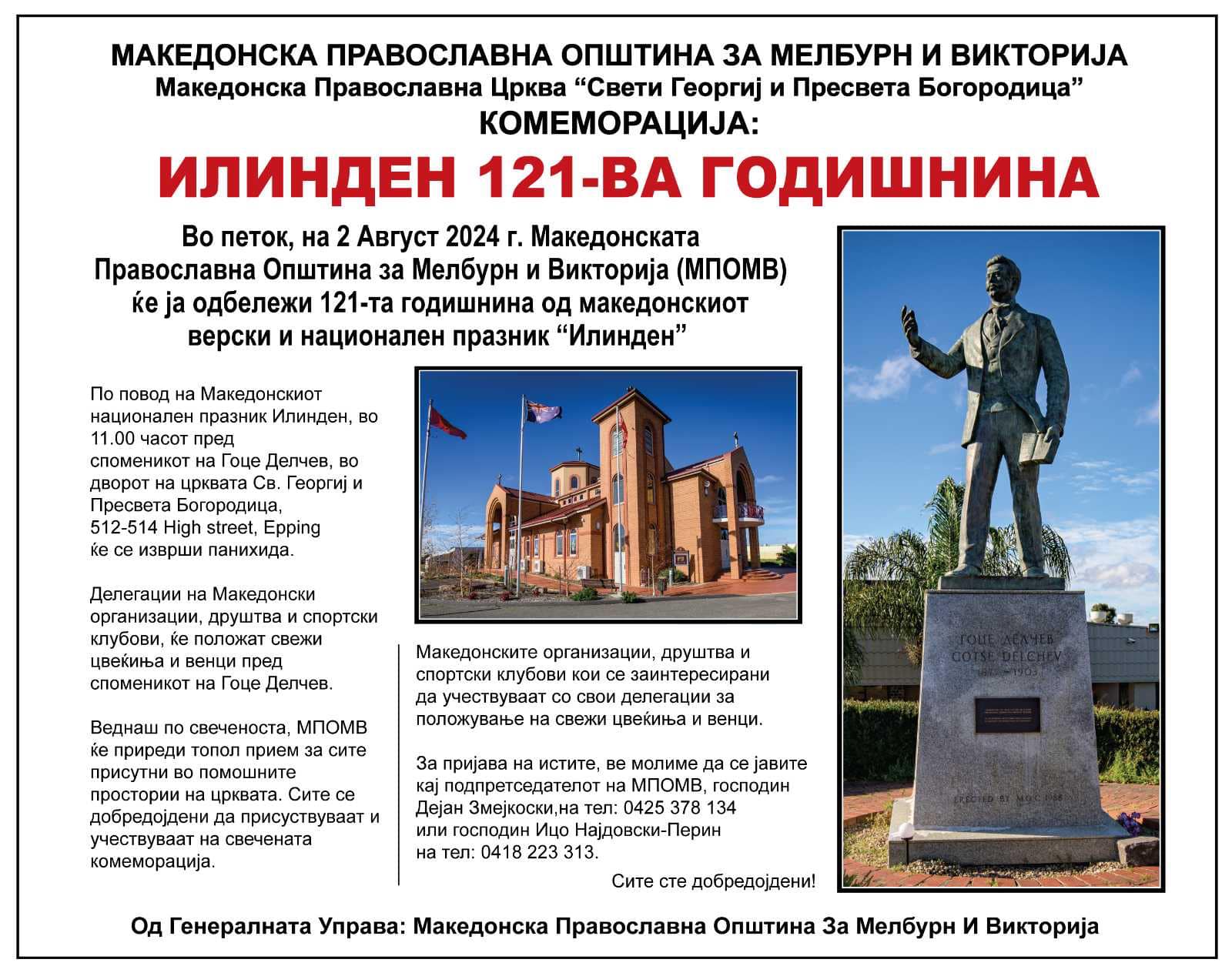 Се известува целокупната македонска јавност и се поканува да присуствува на овогодинешното одбележување на големиот празник Илинден, кое што ќе се одржи на ден 02 август (петок) со почеток во 11 часот пред споменикот на Гоце Делчев во дворот на храмот „Свети Георгиј и Пресвета Богородица“ во Епинг, Мелбурн.
