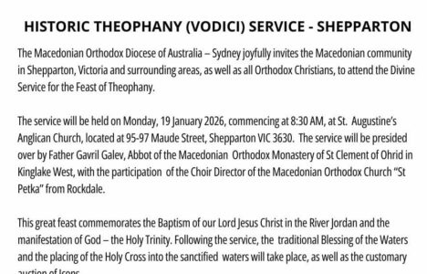 ИЗВЕСТУВАЊЕ ЗА ИСТОРИСКА ПРОСЛАВА НА БОГОЈАВЛЕНИЕ (ВОДИЦИ) ВО ШЕПАРТОН! Македонската Православна Епархија за Австралија – Сиднеј со голема радост ве поканува на божествена литургија по повод празникот Богојавление. Кога: Понеделник, 19 јануари 2026 година Време: 08:30 часот наутро Локација: Англиканска црква „Свети Августин“ (95-97 Maude Street, Shepparton VIC 3630) Со богослужбата ќе началствува Отец Гаврил Галев, а по литургијата ќе се одржи традиционалниот чин на Осветување на водите и положување …
