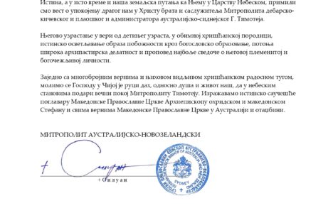 ТЕЛЕГРАМА СО СОЧУВСТВО ПО ПОВОД УПОКОЕНИЕТО НА МИТРОПОЛИТОТ ТИМОТЕЈ ОД СТРАНА НА МИТРОПОЛИТОТ АВСТРАЛИСКО-НОВОЗЕЛАНДСКИ Г. СИЛУАН ОД СПЦ