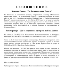 Во сабота на 6-ти мај 2017г. Македонската Православна Општина за Мелбурн и Викторија (МПОМВ) ќе ја одбележи 114-та годишнина од смртта на Гоце Делчев.
