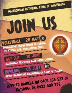 Македонската православна младина на Австралија секој месец ќе организира по еден настан, па по тој повод Ве повикуваме на заедничко дружење и на останатите следни настани: