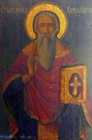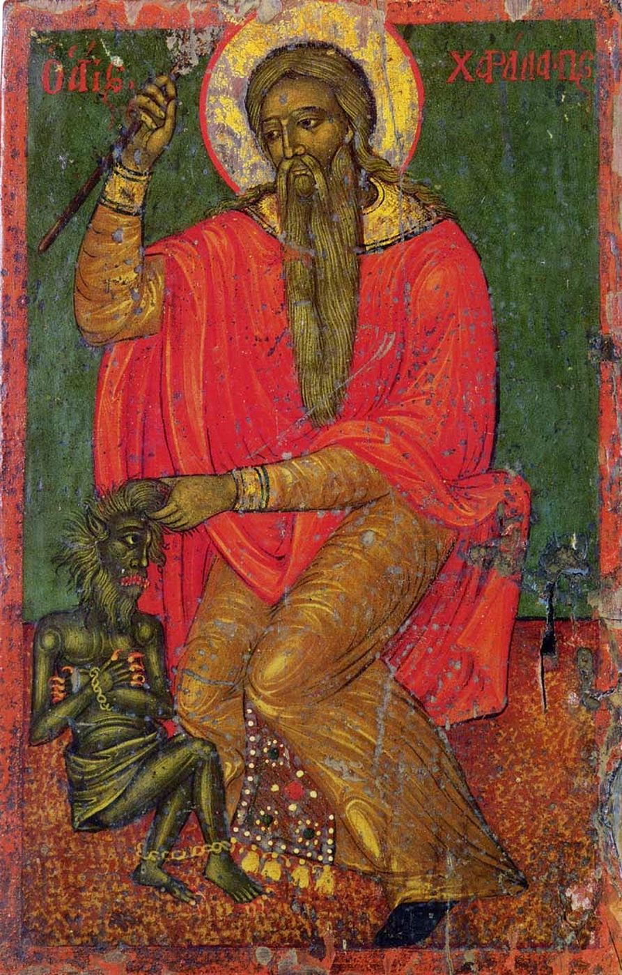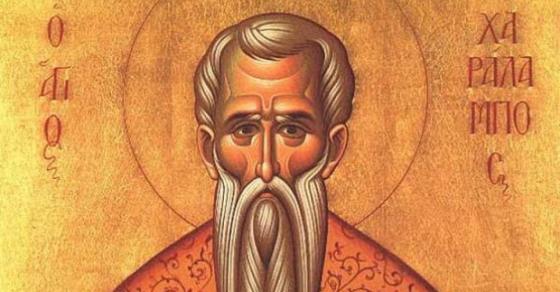 Овој голем светител беше епископ во Магнезија и во својата сто и тринаесетта година пострада за Христа. Кога настана страшното гонење на христијаните во времето на царот Септимиј Север, старецот Харалампиј не се криеше од гонителите, но слободно и јавно ја проповедаше Христовата вера. Сите маки ги претрпе како во туѓо тело. А кога уште жив му ја дереа кожата, незлобливиот светител им рече на царските војници: „Ви благодарам, браќа, зашто ми го иструживте старото тело, а ми го обновивте духот за нов, вечен живот“. Изврши многубројни чуда, во верата обрати многумина. Дури и царската ќерка Галина го напушти незнабоштвото на својот татко и стана христијанка. Осуден на смрт и изведен на губилиштето Св. Харалампиј ги воздигна рацете кон небото и Му се помоли на Бога за сите луѓе, за да им даде Бог телесно здравје и спасение на душите и да ги умножи земните плодови. „Господи, Ти знаеш дека луѓето се месо и крв; прости им ги гревовите и излеј ја Твојата благодат врз сите!“ После молитвата овој свет старец ја предаде својата душа на Бога пред да го спушти џелатот мечот врз неговиот врат. Пострада во 202 година. Неговото тело го зеде Галина и чесно го погреба.