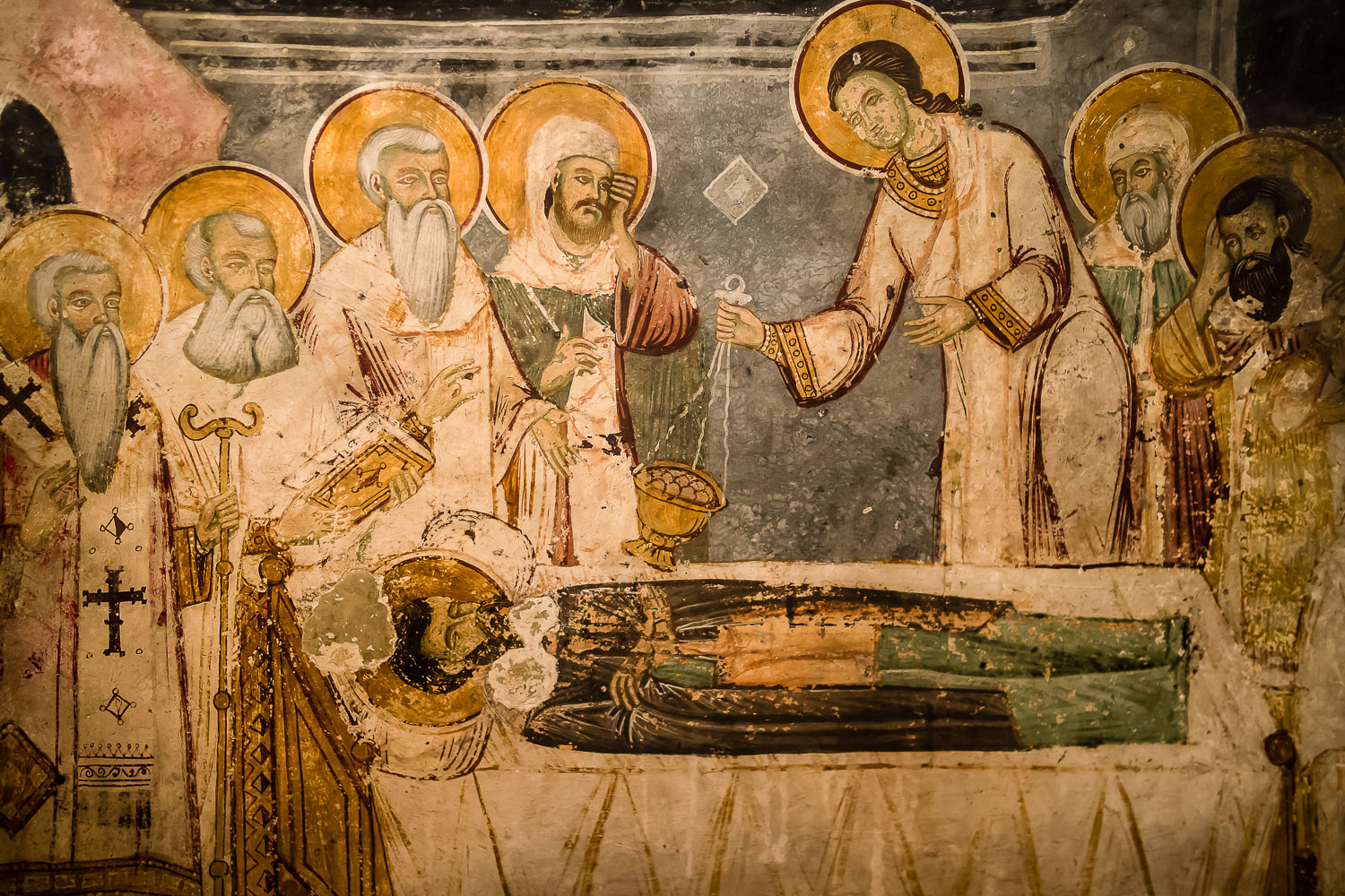 Според истражувачите црквата била фрескоживописана по 1400 година на што упатува еден фрагмент најден под подот на сегашната црква. Денешниот фрескоживопис е дело на зографот Трпо, син на зографот Константин од Корча, фрескописањето се случило за време на игуменот Стефан. Гробниот параклис е живописан во 1800 година, и во него доминираат сцени од животот (житието) и чудата на свети Наум. Исто така, треба да се забележи дека во гробниот параклис се наоѓа и портретот на игуменот Стефан, како и на монахот Ефтимиј кој се обидел да ги открие моштите на свети Наум. Додека, пак, наосот е фрескописан по шест години, за што сведочат еден ктиторски натпис како и натписот над западната врата. Истиот претставува продолжение на нашата богата традиција која била инспирација на зографот Трпо. Наосот е исполнет со многу композиции и сцени од големите празници, а во олтарниот простор се претставени ликовите на великите архиереи, причестувањето на апостолите и Богородица со Христос.