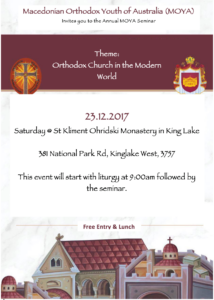 По Литургијата, во манастирот, во организација на Македонската православна младина на Австралија (МОYА) се одржа Македонскиот православен духовен семинар на тема: „Православната црквата во современиот свет (проблеми, решенија и предизвици)“.