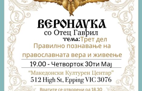 Почитувани верници, Ве известуваме дека третиот дел од предавањето „Правилно запознавање на православната вера и живеење“ ќе се оддржи утре, на 30 мај 2024 година со почеток од 18:30 часот во просториите на Македонскиот културен центар во Епинг. Сите сте добредојдени!