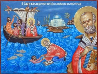 The Bishop of Patara decided to go on pilgrimage to the holy places at Jerusalem, and entrusted the guidance of his flock to St Nicholas, who fulfilled this obedience carefully and with love. When the bishop returned, Nicholas asked his blessing for a pilgrimage to the Holy Land. Along the way the saint predicted a storm would arise and threaten the ship. St Nicholas saw the devil get on the ship, intending to sink it and kill all the passengers. At the entreaty of the despairing pilgrims, he calmed the waves of the sea by his prayers. Through his prayer a certain sailor of the ship, who had fallen from the mast and was mortally injured was also restored to health.