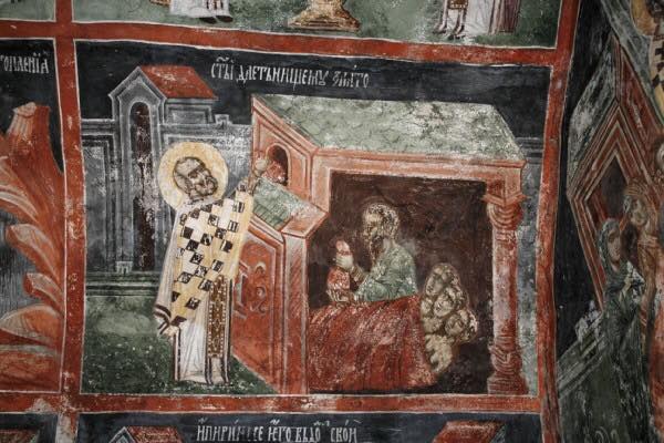 As the fruit of the prayer of his childless parents, the infant Nicholas from the very day of his birth revealed to people the light of his future glory as a wonderworker. His mother, Nonna, after giving birth was immediately healed from illness. The newborn infant, while still in the baptismal font, stood on his feet three hours, without support from anyone, thereby honoring the Most Holy Trinity. St Nicholas from his infancy began a life of fasting, and on Wednesdays and Fridays he would not accept milk from his mother until after his parents had finished their evening prayers.