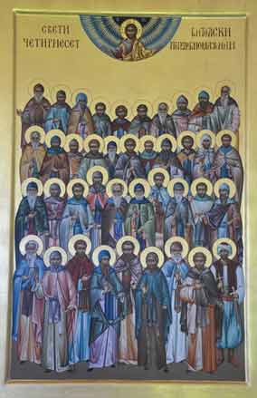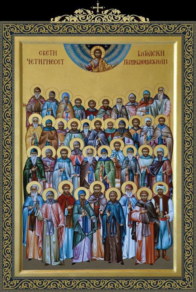 Bо времето кога Османлиите го освоиле градот Битола, по четиримесечна опсада и тешки, жестоки битки, следеле страшни настани: жителите биле убивани, жените силувани, свештениците, монасите и монахињите мачени и погубувани; храмовите биле ограбувани и сквернавени, а потоа и до темел палени. Особено големо крвништво варварите покажале кон свештениците и монасите, кои за сето време на борбите непрестајно го поучувале и поткрепувале верниот народ, поттикнувајќи го да се бори докрај за својот Спасител и Творец – Христос. Најревносните проповедници и чувари на верата, претежно млади монаси со неколку опитни Старци, заедно триесет и девет на број, од повеќе битолски манастири и скитови, кои по Божја промисла ги преживеале страшните настани, се повлекле во манастирот „Свети Георгиј Победоносец“. Но, Османлиите откриле каде се кријат овие монаси и ги заробиле. Најпрвин жестоко ги мачеле, потоа ги фрлиле во зандана, а утредента, доведувајќи им ги најдобрите мухамедански учители, започнале ласкаво да им се додворуваат и да ги убедуваат да се откажат од Христос. Започнала препирка за тоа која вера е вистинската, при што монасите мудро одговарале, темелејќи ги своите зборови на Светото Писмо и светоотечкото Предание, и така постигнале победа во дијалогот. Откако го проследил со големо внимание овој дијалог, еден Турчин, кој се викал Хасан, а им служел како преведувач на препирачите, се восхитил и бил трогнат од неочекуваната духовна длабочина и големото христијанско смирение на овие блажени души, па громогласно извикал: „Голем е Бог на христијаните, и јас сум Христов! Навистина, роден сум како мухамеданец и воспитан сум во мухамеданскиот закон, но сега го примам Божјиот призив што ме повикува во царството на Исус Христос, Синот Божји и Господ мој“. Тогаш Агарјаните се нафрлиле на својот сонародник и толку силно го претепале што на телото на маченикот не останало неповредено место, а потоа го фрлиле во занданата, заедно со останатите Христови преподобномаченици. Утредента, кога посрамените Агарјани увиделе дека монасите се непопустливи, исполнети со гнев, ги осудиле на смрт сите четириесетемина и ги повеле кон височинката на Баирскиот рид за таму да им ги отсечат главите. Одејќи кон својата Голгота, светите биле радосни, како да одат на свадбена веселба. На 9 март 1385 година, Осмaнлиите им ги отсекле главите и така преподобномачениците ја покажале својата бестрашност, извојувале неовенлива победа и го добиле венецот на славата од Господ, својот Подвигоположник, за да се радуваат вечно во Неговото царство, молејќи се за сите оние што верно го почитуваат нивниот свет спомен.