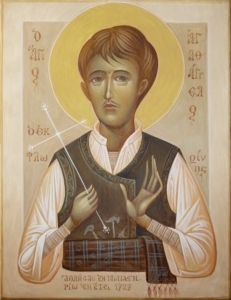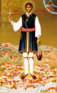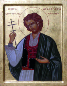 Овој македонски светител пострада од Агарјаните во 1727 година. Како што пишува на кивотот во кој денес во Бигорскиот манастир се чува неговата чесна глава, во тој период од нивното петвековно владеење со македонските краишта Агарјаните имале необичен и свиреп обичај за време на тридневното празнување на Бајрам насилно да го преведат во својата исламска вера секој христијанин што ќе го нашле. Во страв и трепет пред нивниот незадржлив гнев незаштитените и угнетени христијани се сокривале кој како умеел и можел. Раката на друговерните гонители пак, секогаш успевала да докачи по некоја нејака жртва и да го изврши злото над невиниот човек. Мнозина од уловените македонски христијани гонителите ги наоѓале неподготвени да појдат на маченички подвиг и исходот на спасението на оние што го примале исламот под тешка закана останувал неизвесен. Но Бог разгоре љубов кај Својот храбар следбеник Агатангел, кој реши да се дрзне, та со помош Божја да му стави крај на нечесното затирање на кревките и неопитни души. Поттикнат од благодатта Божја, свети Агатангел појде во царскиот сарај и со богомудри зборови пред турските големци се заложи тоа насилно исламизирање на невините христијани на Бајрам да запре. Со содејство Божјо светителот успеа да најде милост пред агарјанските првенци и тие, според ферманот приготвен за таа добра намера, го укинаа гонењето на христијаните на Бајрам. Но Бог, за да ја открие вистинската верност на Својот ревнител Агатангел им допушти на неколкумина Агарјани во Битола да му се нафрлат на светиот маж и да го погубат. А свети Агатангел чесно пострада од нив, простум примајќи го својот небесен венец од Христа, Кому Му поверува: „Секој што ќе Ме признае Мене пред луѓето, ќе го признаам и Јас него пред Мојот Отец небесен. А кој се одрече од Мене пред луѓето, и Јас ќе се одречам од него пред Мојот Отец небесен.” (Мат. 29 – 33)