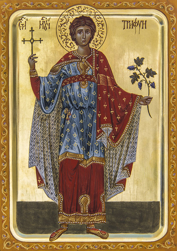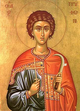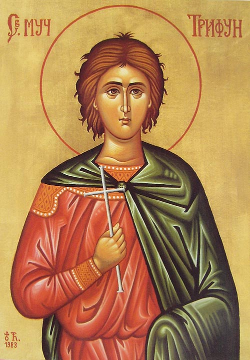 Роден е во селото Кампсада во Фригија од сиромашни родители. Во детството беше чувар на гуски. И уште од детството врз него беше голема Божја благодат и можеше да исцелува болести кај луѓето и кај животните и да изгонува бесови. Во тоа време со Римското царство завладеа царот Гордијан, чијашто ќерка слезе од умот и со тоа го фрли царот во голема жалост. Ниеден лекар не можеше да ѝ помогне на лудата Гордијана. Тогаш демонот прозборе преку девојката и рече дека освен Трифун никој не може да го истера. После многумина Трифуни ширум царството, по Божја Промисла го повикаа и овој млад Трифун. Го доведоа во Рим и тој ја исцели царската ќерка. Царот му подари многубројни дарови, а тој на враќање им ги раздели на сиромасите. Потоа ова свето момче продолжи да чува гуски и да Му се моли на Бога. Кога се зацари христоборниот Декиј, Свети Трифун беше малтретиран и свирепо измачуван заради Христа. Но тој со голема радост ги поднесе сите мачења, велејќи: „О кога би можел да се удостојам во оган и маки да завршам за името на Исус Христос, мојот Бог и Господ!“ Маките не му наштетија ни малку и најпосле мачителите го осудија на смрт со меч. Му се помоли на Бога и издивна во 250 година.